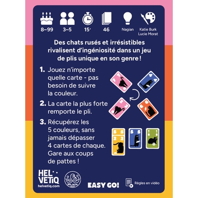 Référence : 99484Conditionnement de vente : 4 Designation : CAT TRICK Famille : Easy GoRayon : Jeux De SocieteDescriptif : Pour 3 à 5 joueurs