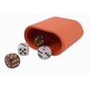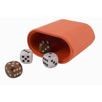 Extérieur et gobelet en cuir synthétique, intérieur également en marqueterie de cuir vegan, pions et dés nacrés.