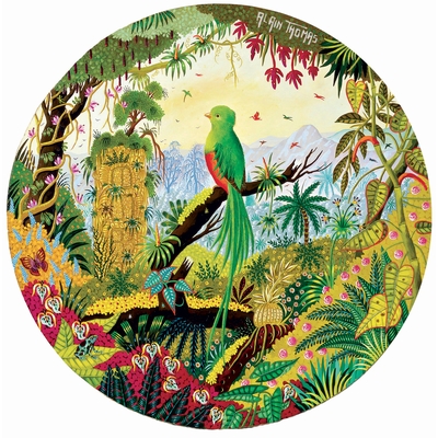 Alain Thomas est un peintre contemporain nantais considéré comme le chef de file de l'école "naïve primitive". Il représente ici, avec une précision naturaliste le quetzal resplendissant, l'oiseau emblème du Guatémala. La végétation est imaginaire, entrelaçant parfois des plantes réelles. Et toujours, un papillon, un insecte et un ibis rouge font partie du décor.